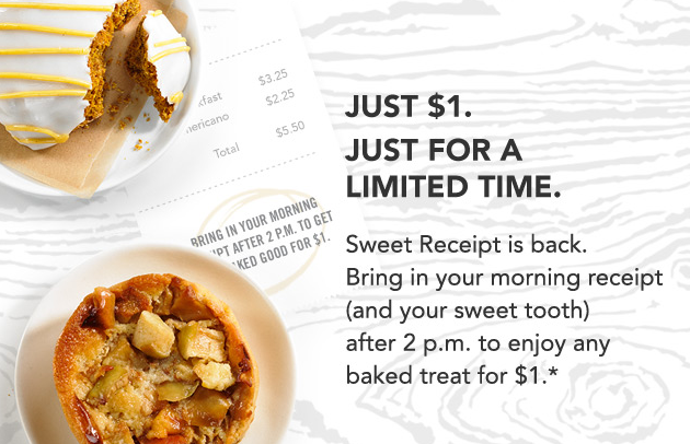 It's back!  Starbucks is offering any baked treat for $1 when you show your morning receipt at checkout after 2pm.